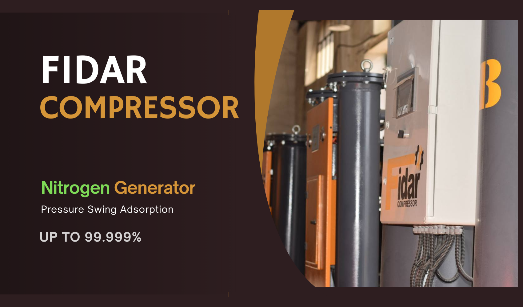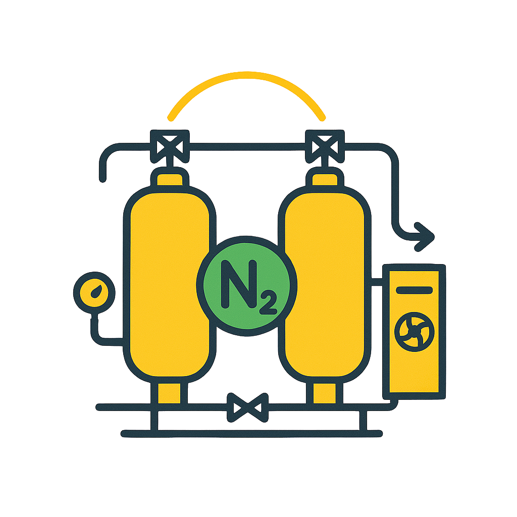 Fidar Compressor PSA Nitrogen Generators produce nitrogen with purities of up to 99.999%. The CMS bed, with selective oxygen adsorption, delivers a stable and safe gas suitable for sensitive industries such as electronics, laser, pharmaceutical, and packaging.