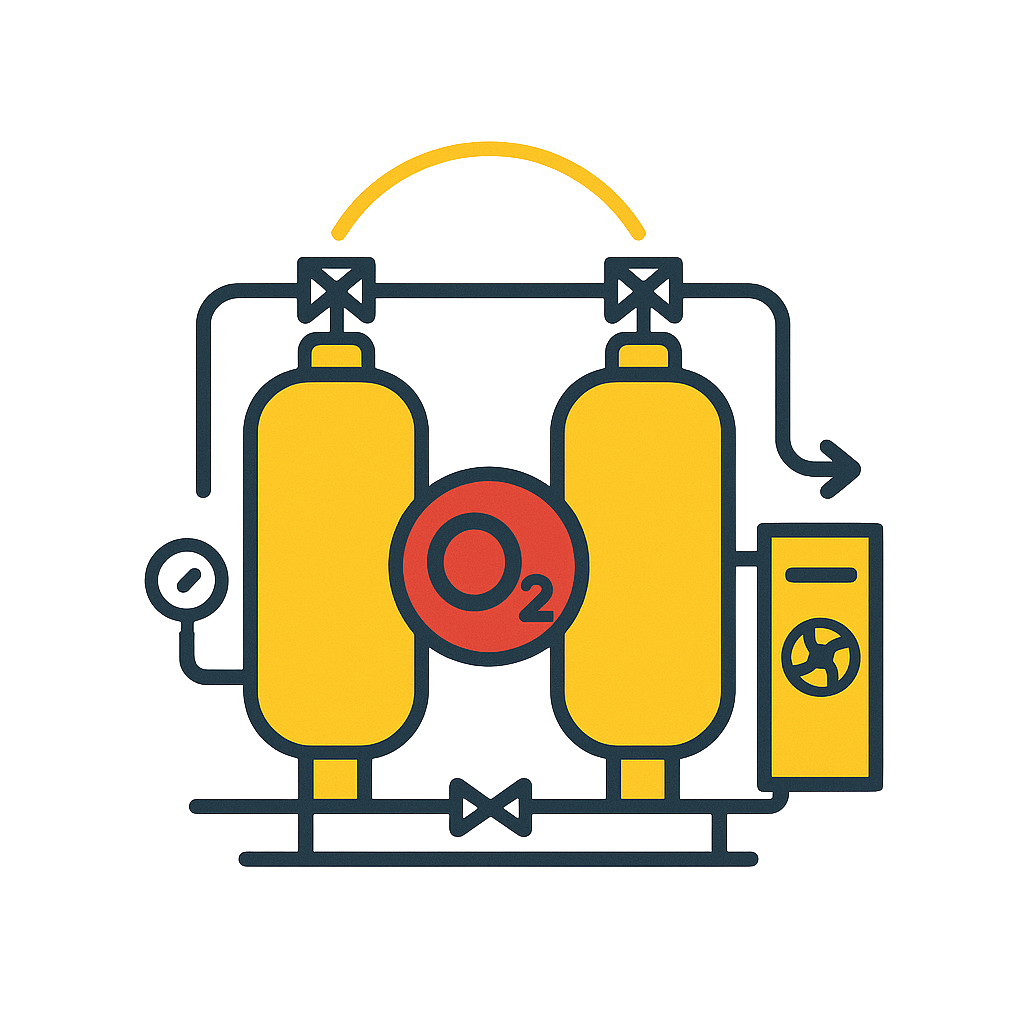 Fidar Compressor PSA Oxygen Generators continuously produce oxygen with a purity of 93% ±2%. The use of high-quality zeolites and precise control of the adsorption cycle ensures a stable and reliable gas, suitable for medical, industrial, cutting, and water treatment applications.