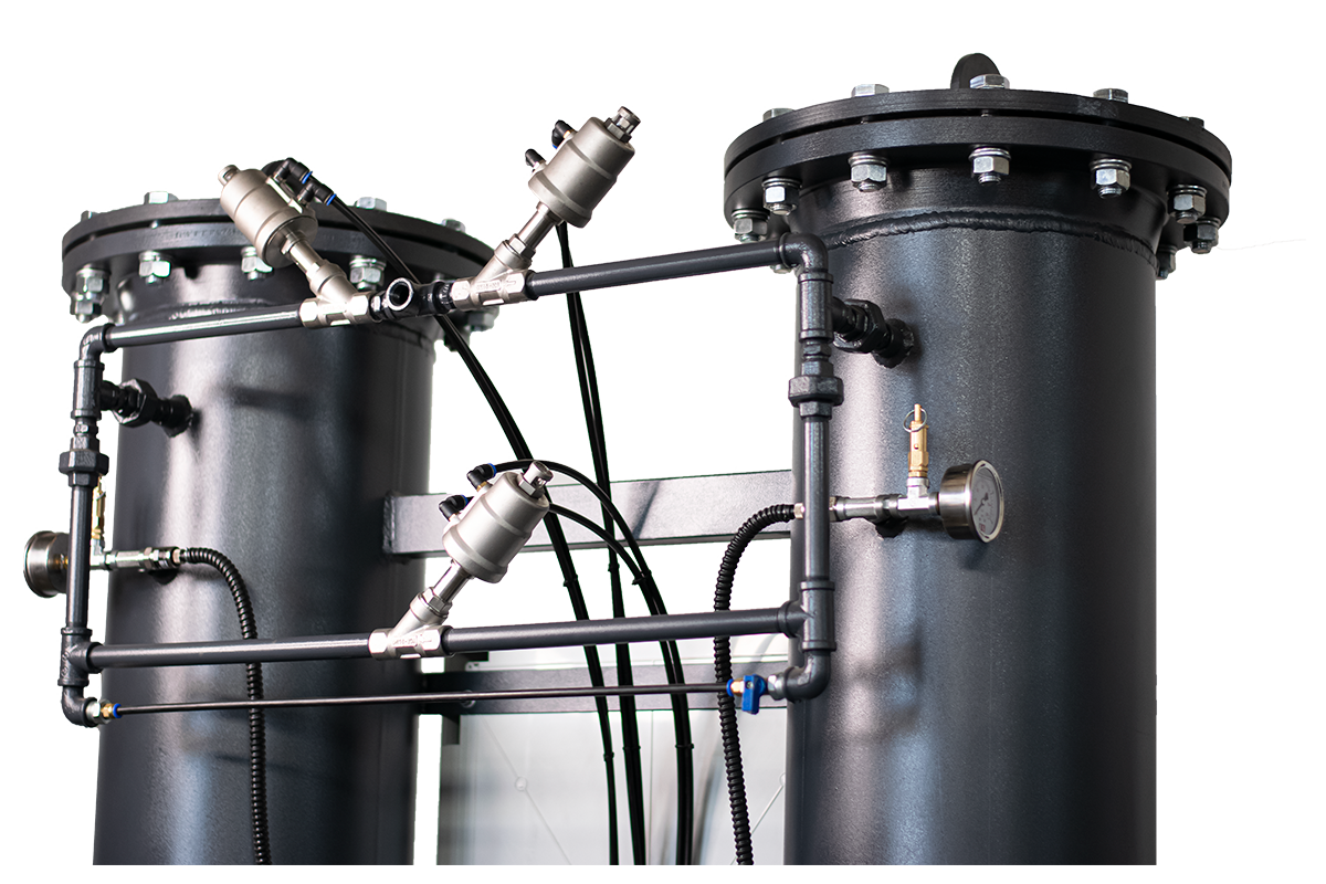 The oxygen produced at the top outlet is directed into an oxygen buffer tank, where the pressure is equalized before being delivered to the consumption line.